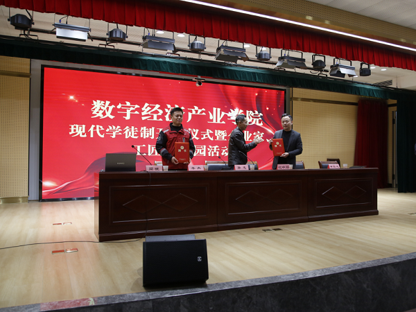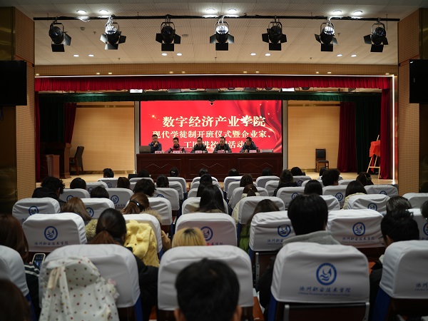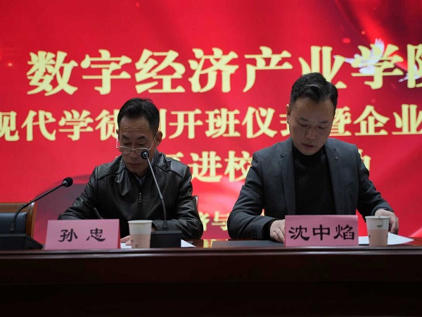 为深入学习贯彻党的二十届四中全会精神,推进数字经济产业学院建设与区域经济协同发展,深化产教融合与校企合作,12月3日下午,集团学院池州职业技术学院经济与管理系在学术报告厅1楼举行数字经济产业学院现代学徒制开班仪式暨优秀企业家、工匠进校园活动。池州新孛商务咨询有限公司法人、总经理沈中焰,现代物流管理专业省级产业教授、池州俊华速递物流有限公司综合部主管羊杰出席活动。集团学院池州职业技术学院经济与管理系党务学工科科长、教务科科长、专业群教学研究室部分教师及专兼职辅导员参加活动。活动由系副主任孙忠主持。
